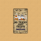- Design: Vintage-style background with illustrated ghost dogs, pumpkins, bats, and webs; customizable with a closing & name